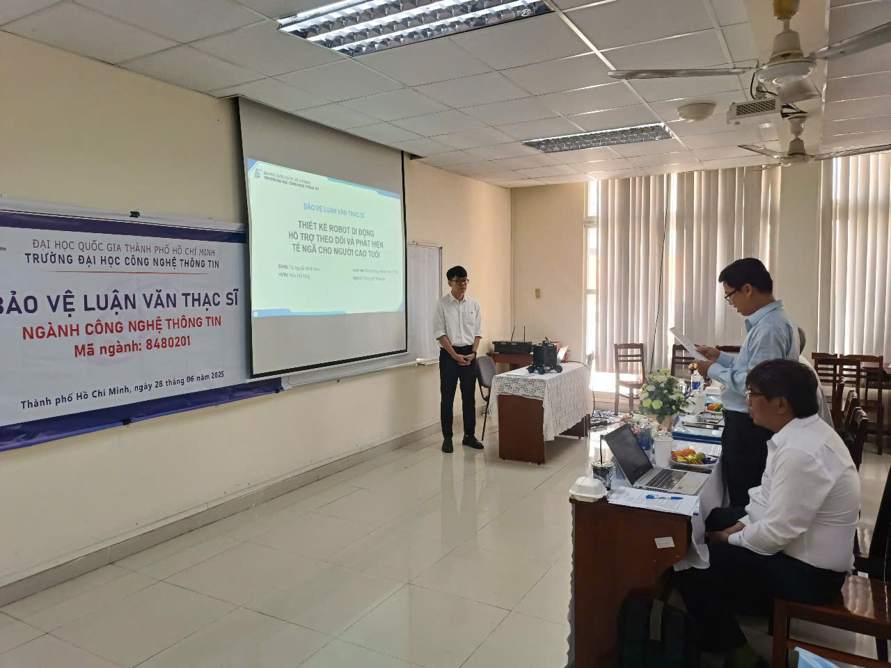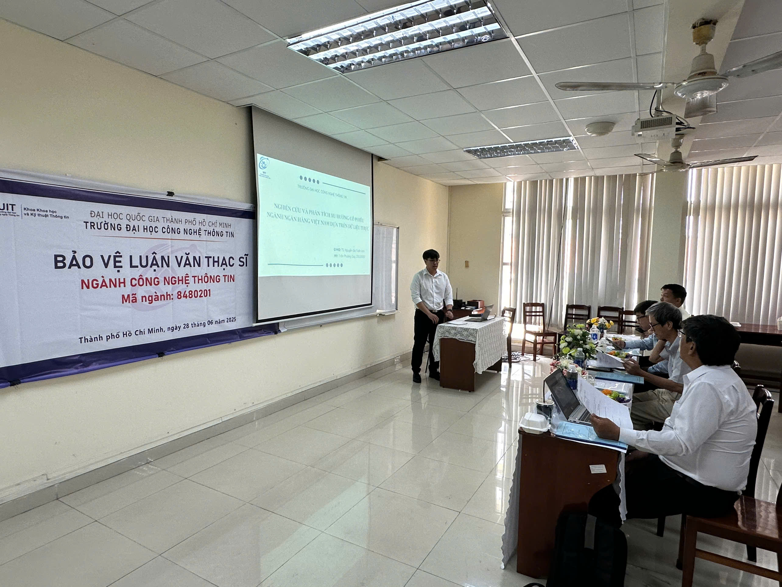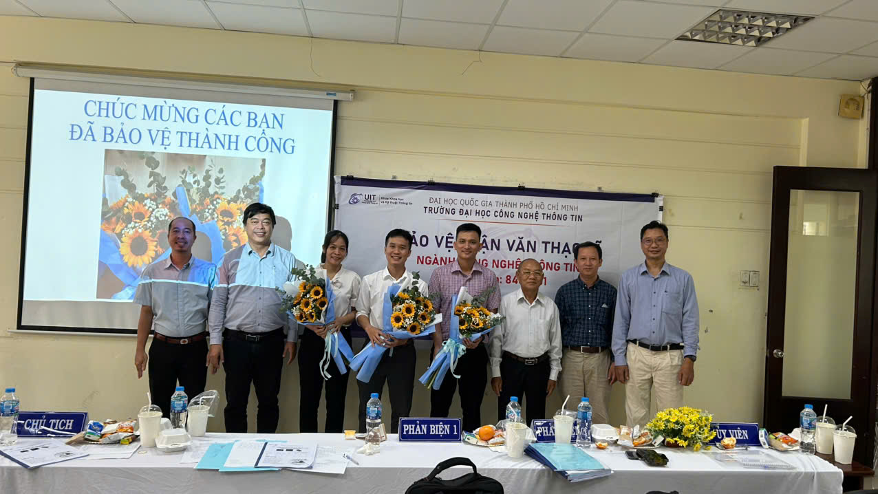 Sáng ngày 28/06/2025, 11 học viên cao học ngành Công nghệ thông tin đã bảo vệ thành công luận văn thạc sĩ trước hội đồng chuyên môn. Trong phần trình bày, các học viên đã giới thiệu kết quả nghiên cứu, minh họa giải pháp bằng demo hệ thống, và trả lời các câu hỏi phản biện từ hội đồng đánh giá.